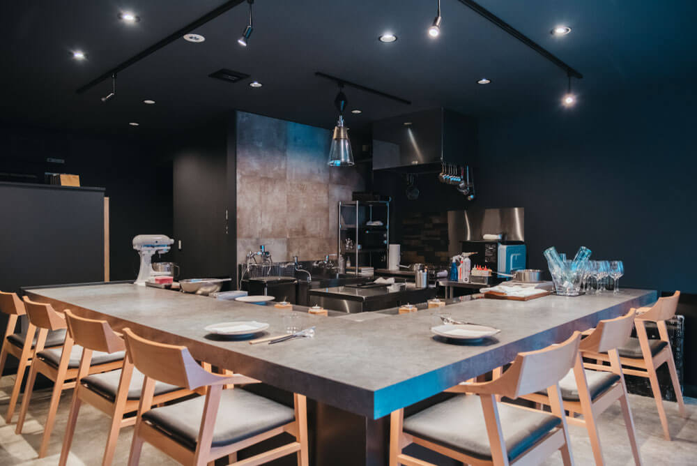 メインのL字カウンターの中心に鉄板を配置し、間接照明や調光照明にこだわり